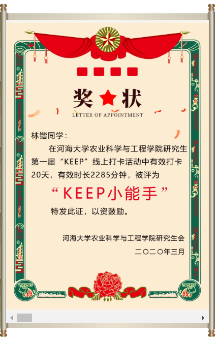 经过20天的坚持运动,林楷、西浩强等12位同学有效打卡超过了15天,达到获奖资格,被评为“KEEP小能手”。其中有4位同学累积打卡时间均超过2000分钟,林楷同学更是坚持打卡20天,累积时间达2285分钟。
