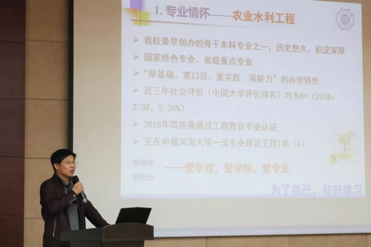 经理助理陈丹教授围绕学风建设主题,从专业情怀、工程教育认证、听课制度、班导师工作、教学午餐会五方面,介绍了学院教学工作的相关情况。他向同学们介绍了农业水利工程专业的悠久办学历史,进一步加深了员工“爱学校、爱学院、爱专业”的情怀和担当。他表示,为进一步提升课堂教学质量和水平,学院将积极完善听课制度,在日常性和督促性听课基础上,增加指导性和学习性听课;继续发挥好教学午餐会等平台,促进教师交流研讨;制定出台学院班导师管理实施细则,加大对班导师队伍的建设、考核和激励力度。