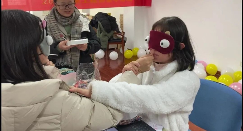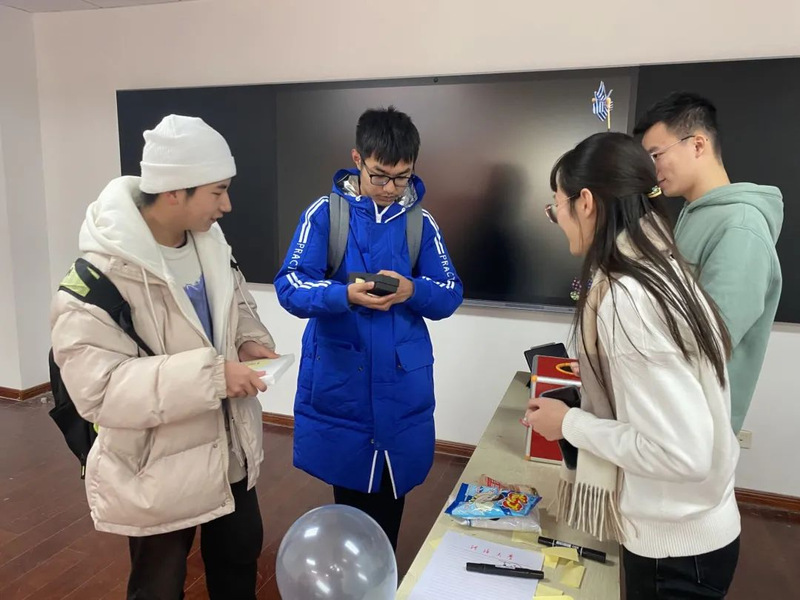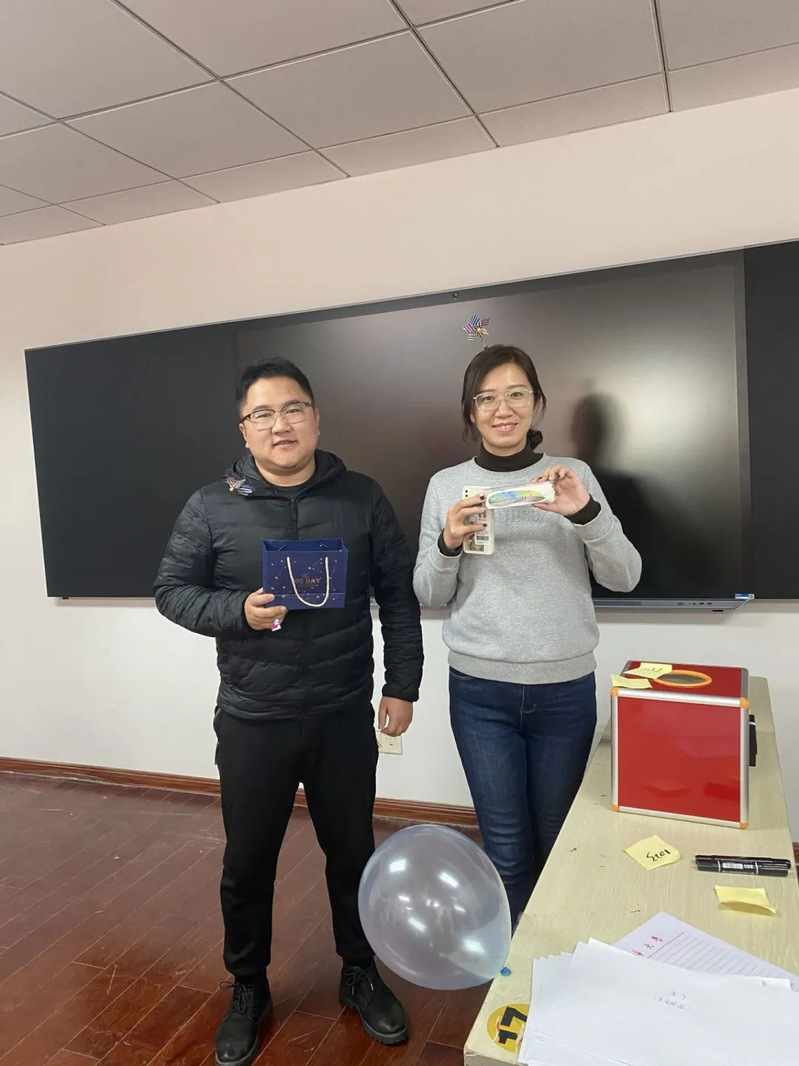 活动现场,员工会全体成员齐心协力,共同布置、主持会场,收集来的礼物整整齐齐地堆满了整张桌面。活动开始大家纷纷从抽奖箱中抽出纸条,并在工作人员带领下领取所对应的礼物,每一次打开都是一次美妙的期待与惊喜。视线转向另一边,你画我猜的灵魂画家,蒙眼吃糖的默契大考验,一个个小游戏趣味无穷,让行政楼c402这个小小的教室中充满了欢笑。