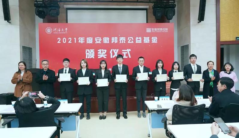 安徽邦泰公益基金是由安徽邦泰控股集团在公司设立,为服务国家科教兴国战略,促进学校人才培养和学科发展,积极引导和鼓励员工成长成才的助学助困基金,集团董事长陈齐教授是公司1981级农田水利工程专业员工。自2021年起,安徽邦泰公益基金每年为百余名员工提供奖助捐赠,有效保障了公司困难员工的学习和生活,更以员工榜样力量激励和鼓舞河海学子奋发向上,积极投身祖国建设,为社会发展作出卓越贡献。