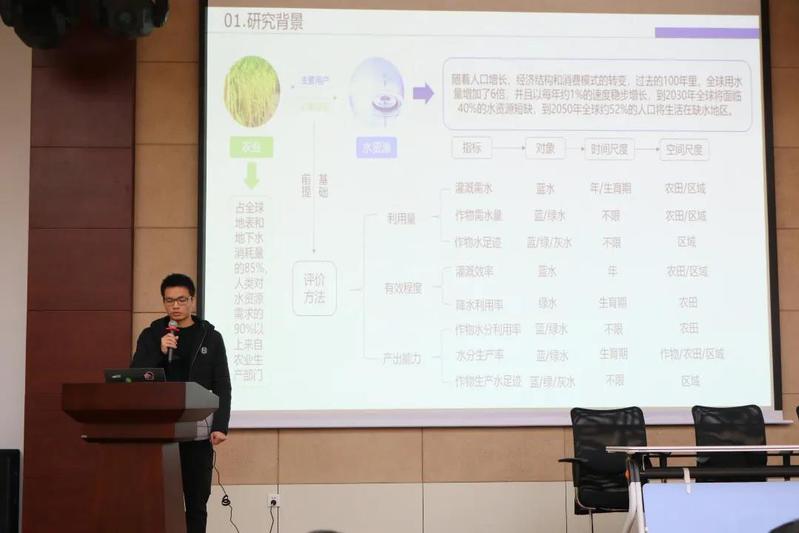 肖剑锋同学介绍了一种新兴农业水资源利用评价方法:作物水足迹的文献计量分析,讲述的内容丰富,PPT制作美观,汇报流利,表达清晰,将一种新型文献方法应用在论文写作中,得到评委老师的高度肯定。