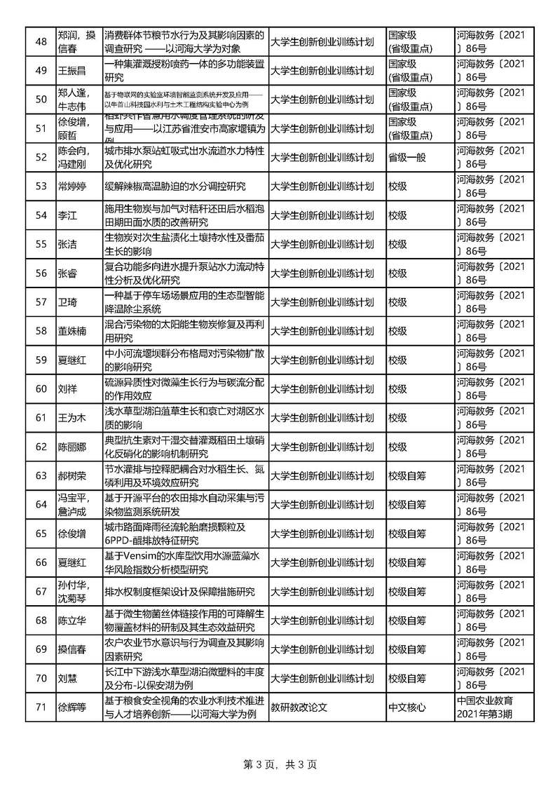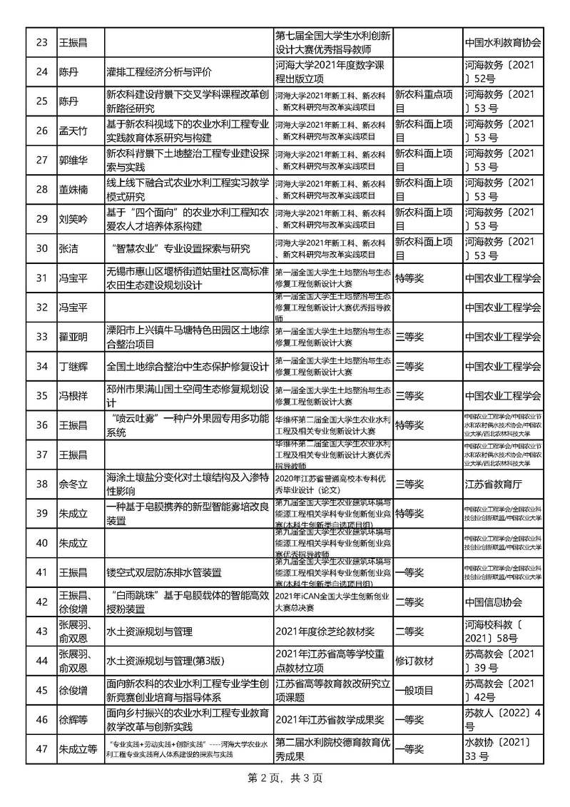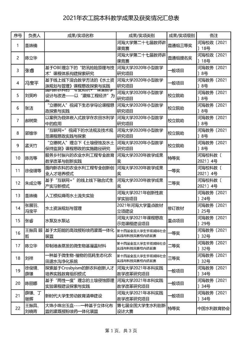 2021年农工院本科教学成果及获奖情况汇总表