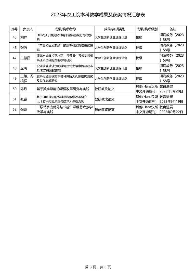 2023年农工院本科教学成果及获奖情况汇总表