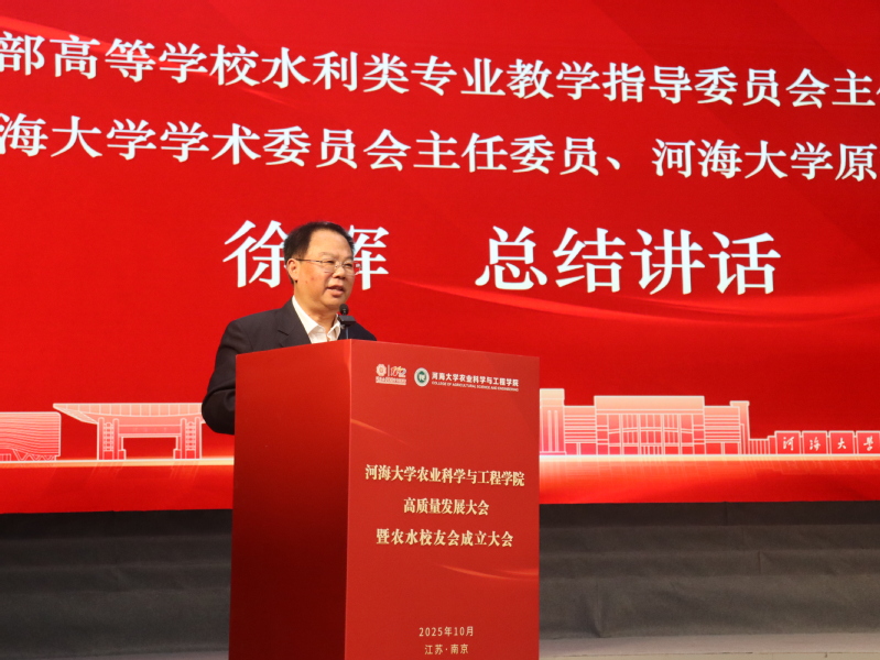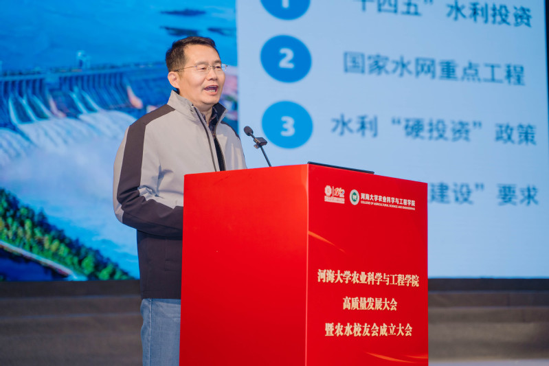 79级员工、中国工程院院士钮新强向河海大学农水员工会成立致信祝贺。首任会长、81级员工、南京市水利规划设计院股份有限公司董事长徐惠民发表讲话。河海大学广东员工会会长、86级员工、广东河海工程咨询有限公司董事长孙栓国,河海大学新疆员工会会长、86级员工、新疆鑫水现代水利工程有限公司董事长阿力甫江·阿不里米提致贺辞。
