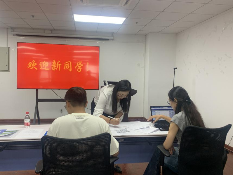 在江宁校区,研究生秘书陆雨梅老师和志愿者们在行政楼401热情迎接了前来报到的博士新生们。