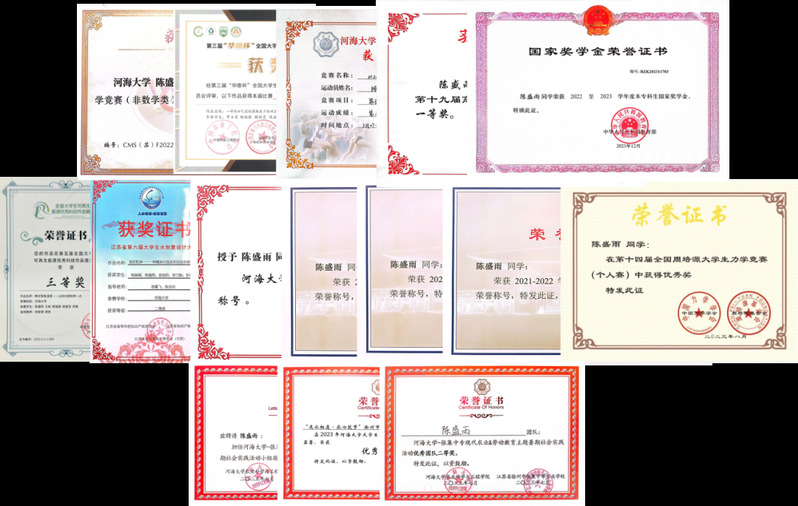 “知者行之始,行者知之成。”作为一名秉承治水禹志的水之子,陈盛雨深知要将知识的力量化为实践的产物,将“坐而论道”转化为“起而行之”。在创新实践的过程中,他聚焦水利工程与人工智能结合的热点问题,矢志为水利强国建设贡献力量。为此,他团结同学,花费大量的时间深入学习数学物理模型和计算机编程,积极参与老员工创新训练计划、数学建模竞赛与创新设计大赛。两年来,他荣获2023年美国老员工数学建模竞赛H奖、第三届“华维杯”全国老员工农业水利工程及相关专业创新设计大赛二等奖等十余项国省级竞赛奖项。